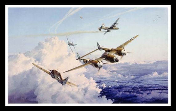 A B-24 has been hit and is losing touch with the main bomber formation, as Luftwaffe pilots concentrated their attentions on the unfortunate aircraft. Two Fw190s, are zooming up for the kill on the damaged B-24. Seeing the desperate situation, a P-38 escort pilot has made a head-on attack, splitting the pair of Fw190s, and thwarting their attempt to finish off the B-24. Another P-38, aware of the situation, is turning into the path of the Fw190s.
